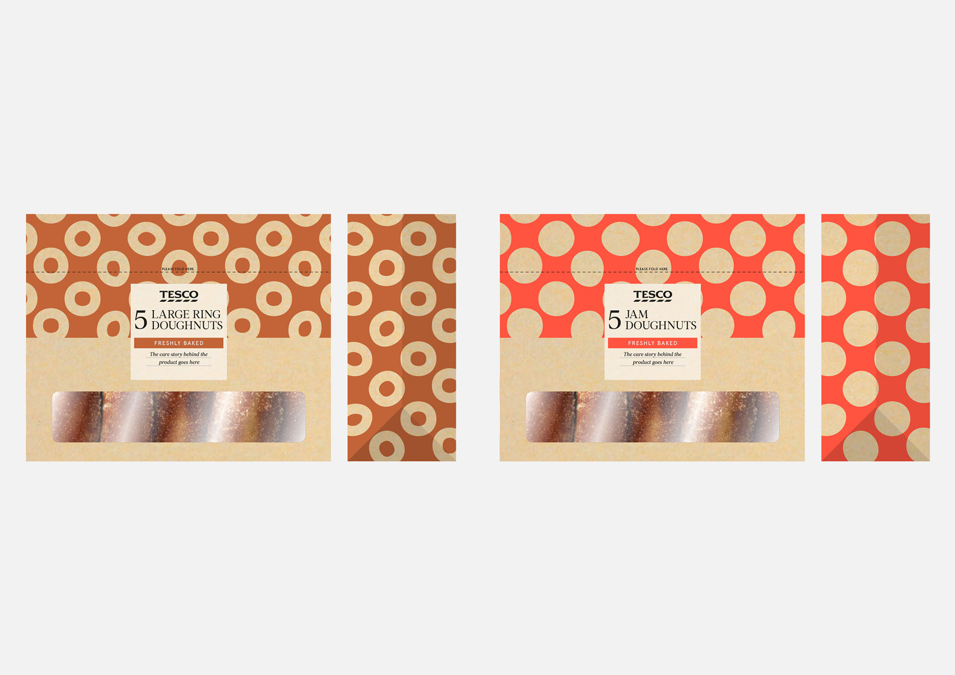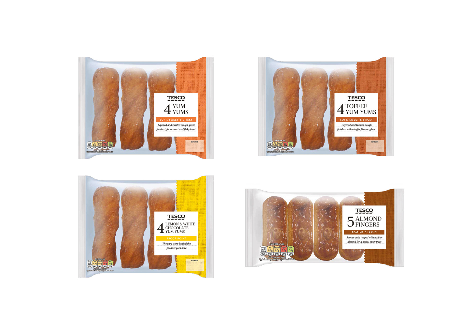 Artwork of various packaging for Tesco's own brand products.
